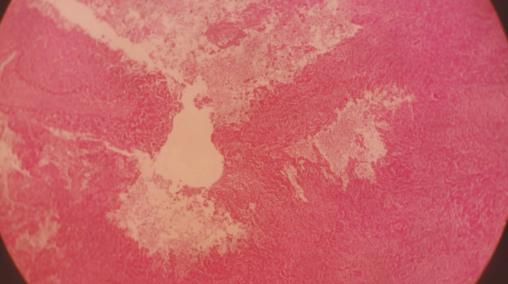 Un angioscanner thoracique objective une embolie pulmonaire bilatérale (fig. 1 ) et une échocardiographie transthoracique montre une masse d’échogénicité hétérogène polylobée mobile mesurant 30 mm, au niveau de l’oreillette droite attachée au septum interatrial (fig. 2 ). L’examen histologique confirme qu’il s’agit d’un thrombus (fig. 3 ). Face à ces résultats, l’indication chirurgicale est posée. Le patient est mis sous traitement anticoagulant, corticothérapie générale et immunosuppresseur.
