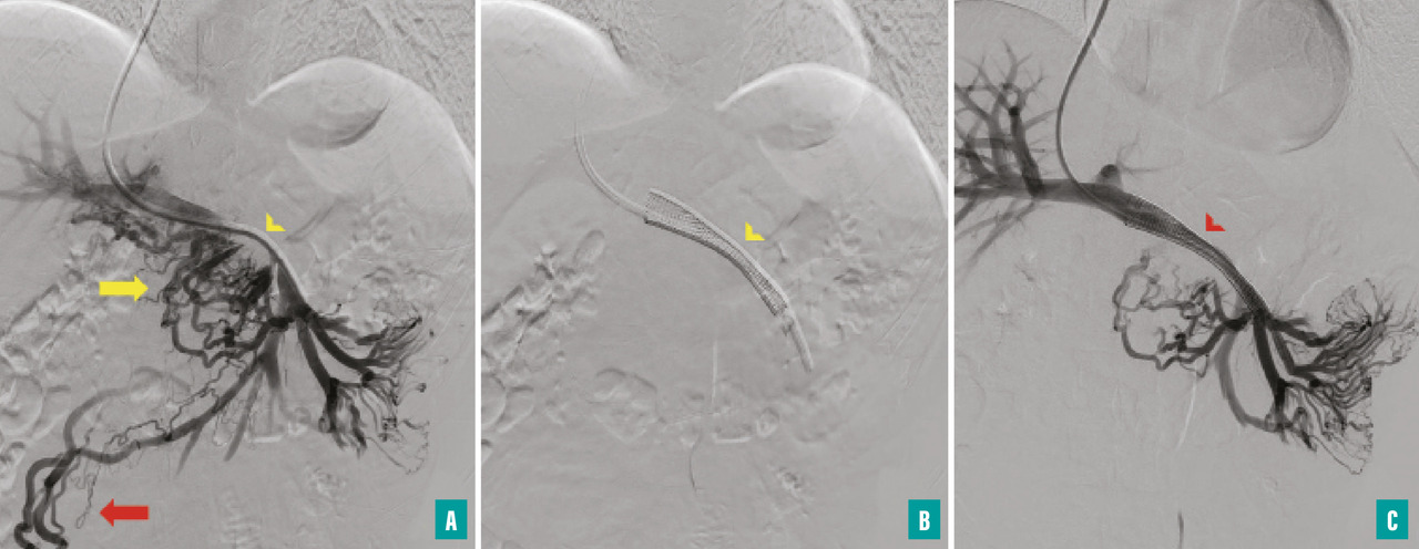 Pour la TVP chronique sans hépatopathie chronique sous-jacente, la recanalisation de la veine porte par voie radiologique doit être envisagée en cas de complications réfractaires au traitement médical, comme des hémorragies digestives liées à l’hypertension portale non contrôlées par un traitement endoscopique, ou en cas de cholangiopathie portale symptomatique (fig. 4). La recanalisation portale s’effectue par la pose d’un stent dans la veine porte ; elle peut être associée à la pose d’un TIPS (transjugular intrahepatic portosystemic shunt) L’abord peut être transhépatique, transsplénique ou transmésentérique. Cette procédure de radiologie interventionnelle est complexe et nécessite une prise en charge multidisciplinaire dans un centre expert, ce qui permet d’obtenir un succès technique de 80 % environ, mais au prix d’un taux de complications d’environ 20 %.21,22