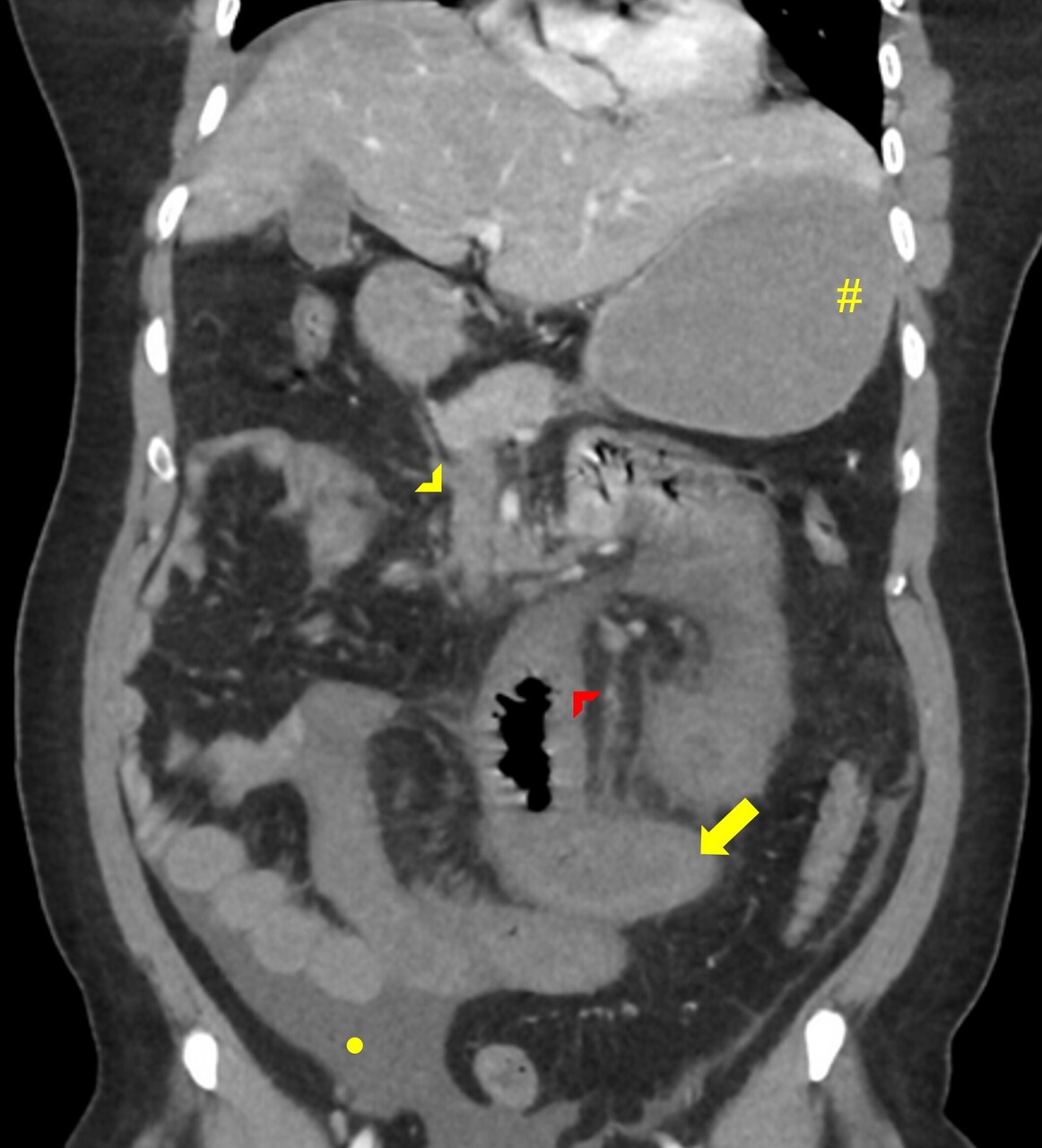 L’ischémie mésentérique est une urgence médico-chirurgicale, avec un risque de résection intestinale d’environ 35 % et une mortalité entre 10 et 30 %.3,23 Il s’agit d’une complication rare lorsque la TVP survient dans un contexte de cirrhose.6 La présentation clinique est superposable à celle de la thrombose portomésentérique aiguë (douleur abdominale, syndrome inflammatoire) et n’est pas spécifique. La persistance ou l’aggravation de la douleur malgré le traitement anticoagulant, l’apparition d’un iléus ou d’une hémorragie digestive doivent faire évoquer l’évolution vers une ischémie mésentérique, même si elle n’était pas présente sur l’imagerie initiale.23