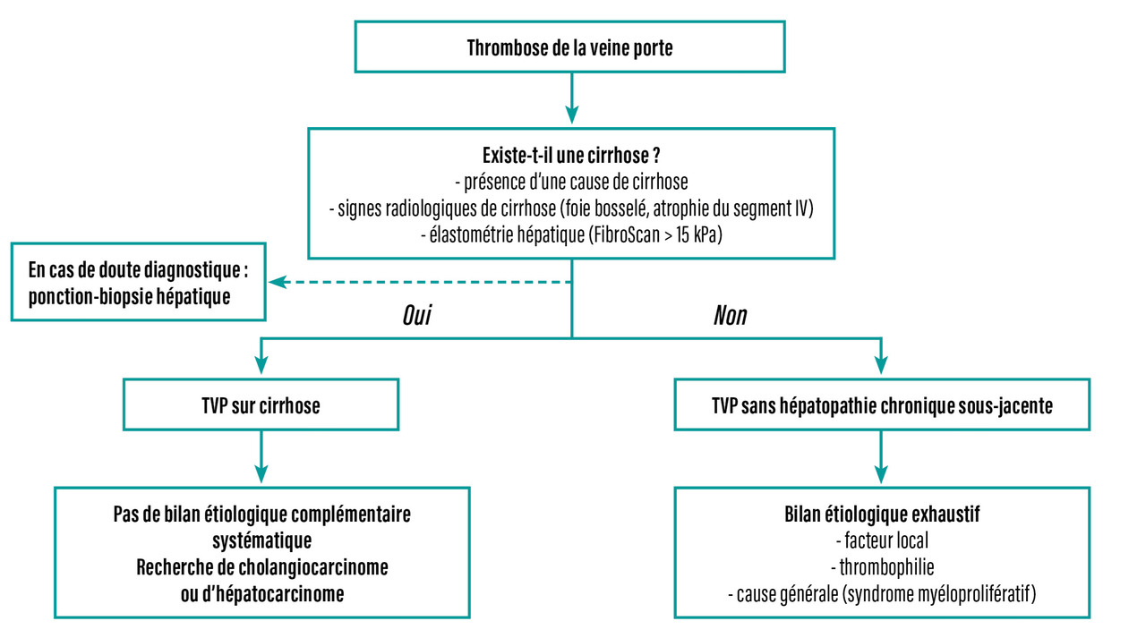 Lors du diagnostic initial, il est donc important de faire la distinction entre une TVP sans hépatopathie chronique sous-jacente et une TVP associée à une cirrhose, car la prise en charge et le pronostic sont différents (fig. 1).