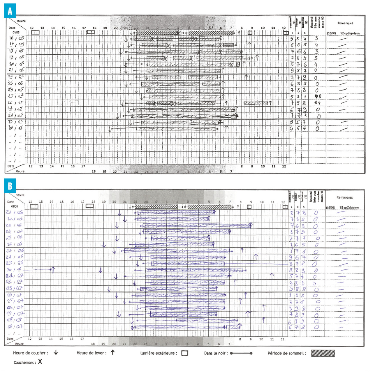 Une adolescente présentait un trouble de stress post-traumatique avec des cauchemars post-traumatiques apparus à la suite de violences sexuelles intrafamiliales. Elle rapportait la présence de cauchemars réguliers observable sur son agenda du sommeil (fig. A). Le contenu de tous ses cauchemars était globalement similaire : soit elle ressentait une sensation vague d’être suivie, soit certains de ses proches apprenaient ce qui lui était arrivé et lui tournaient le dos. Ses cauchemars pouvaient être source d’une charge anxieuse perturbant la continuité de son sommeil.