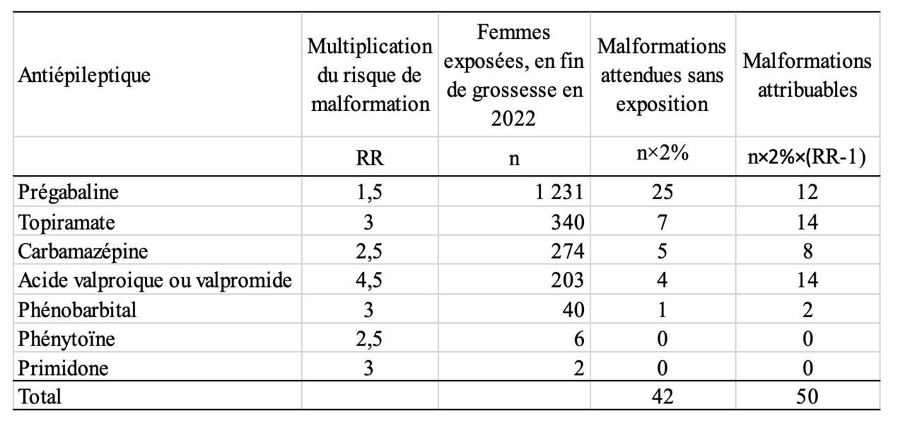 Le tableau 2 présente les estimations du nombre de malformations attribuables aux différents antiépileptiques pour lesquels on dispose d’une estimation du risque relatif de malformations (rapport des risques dans la population exposée et dans la population non exposée). Ces dernières sont imprécises mais donnent des indications sur les ordres de grandeur. La prégabaline est la première cause de malformations chez les enfants exposés à un antiépileptique en 2022, et ceci reste vrai si on suppose que le risque est multiplié seulement par 1,25 au lieu de 1,5. Si ces femmes n’avaient pas été exposées à ces antiépileptiques, on se serait attendu à observer 42 enfants avec une malformation, mais à cause de leur exposition on attend 50 enfants de plus avec une malformation, donc un total de 92 enfants.