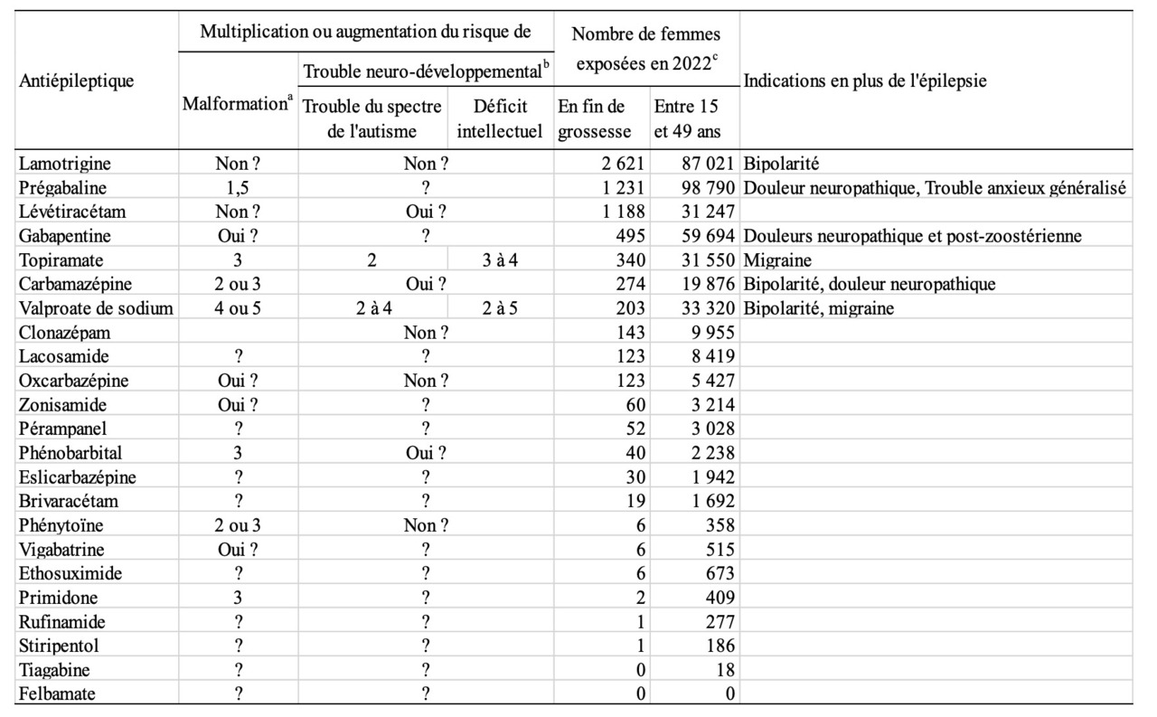 Deux antiépileptiques – le valproate de sodium et le topiramate – sont à éviter absolument pendant la grossesse car les enfants exposés in utero ont un risque très augmenté de troubles neurodéveloppementaux et de malformations. Pour éviter que des grossesses soient exposées à ces médicaments, il ne suffit pas de le proscrire pendant la grossesse. En effet quand une femme épileptique, bipolaire ou migraineuse traitée par l’un de ces médicaments s’aperçoit qu’elle est enceinte, il est trop tard pour éviter l’exposition au début de sa grossesse.