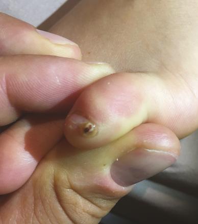 Ce garçon de 10 ans consultait pour une lésion nodulaire, prurigineuse, située dans le sillon unguéal externe du 5e orteil du pied gauche, survenue quelques jours après un séjour à Madagascar. L’interrogatoire relatait de nombreuses périodes de marche sur le sable pieds nus. À l’examen du pied, on notait une lésion unique, blanchâtre à centre ombiliqué noirâtre, légèrement inflammatoire. Le reste de l’examen physique était sans particularité chez cet enfant sans antécédent notable, avec un bon état général. L’extraction manuelle de la lésion à l’aiguille a permis une guérison rapide (