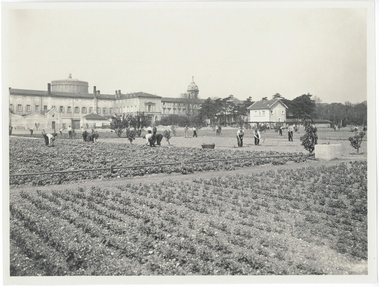 L’essor du nombre de malades présents dans les hôpitaux psychiatriques connaît toutefois des ruptures, notamment pendant les deux conflits mondiaux du XXe siècle. Durant la période de l’Occupation (1940 - 1944), environ 45 000 malades meurent de faim et de froid dans les établissements psychiatriques français,1 même si certains hôpitaux, comme Saint Jean de Dieu à Lyon, ne sont pas touchés aussi massivement par la famine.2 En effet, cet établissement a développé pendant cent cinquante ans sa capacité de production agricole pour nourrir, à certaines périodes, jusqu’à plus de 1 200 personnes vivant sur place. Frères et employés encadrent les malades-travailleurs qui participent pleinement à l’économie de l’institution, en travaillant dans tous les services et à la ferme, contre un pécule journalier. Ce travail productif, considéré comme thérapeutique et occupationnel, cesse dans les années 1980.