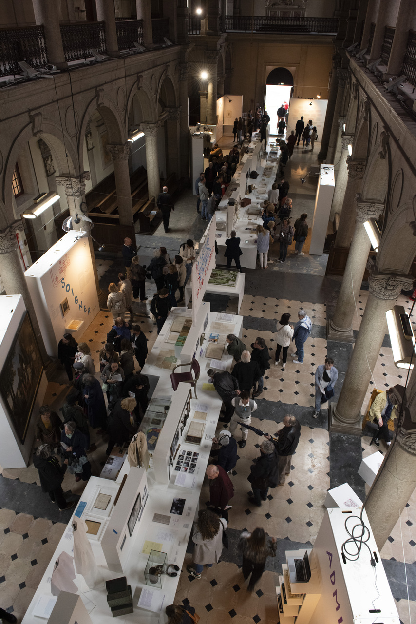 En 2024, le centre hospitalier Saint Jean de Dieu, à Lyon, célèbre son bicentenaire à travers l’exposition « Un long fleuve intranquille » (fig. 4). Cette dernière propose un récit ancré dans un contexte local mais qui permet de saisir une histoire plus large de la psychiatrie et des populations considérées comme vulnérables depuis le XIXe siècle. Cette exposition temporaire prend place dans la chapelle de l’hôpital jusqu’au 31 octobre 2024 ; elle vient clôturer douze années de réflexions et de collectes initiées par un petit groupe de salariés et de retraités – le groupe Mémoire et Patrimoine – et enrichies par un réseau d’acteurs engagés aux côtés de l’hôpital parmi lesquels des musées, l’université Lumière Lyon- 2 et plusieurs services d’archives. Elle invite les visiteurs à plonger dans un dispositif muséographique simple qui traverse l’espace (fig. 1). Archives, tableaux, objets divers et témoignages sonores participent à la mise en récit de l’histoire de cet établissement, du XIXe siècle à nos jours. Le visiteur découvre ainsi, au fil des sections, la création de l’établissement par une communauté religieuse, les métamorphoses du lieu à travers le temps, la pluralité des professions qui font vivre l’institution, la vie quotidienne dans les services, la porosité entre l’intérieur et l’extérieur de l’hôpital, la diversité et l’évolution des modes de prise en charge et de soins ou encore l’arrivée des femmes dans cet univers presque exclusivement masculin jusqu’à la seconde moitié du XXe siècle.