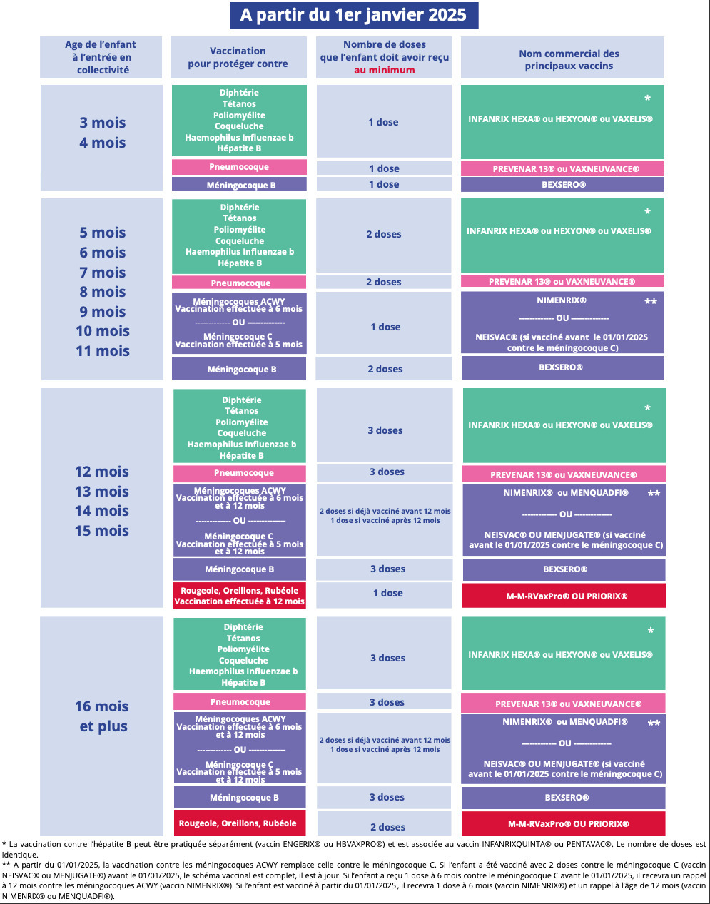 - tout schéma initié avec Nimenrix doit être complété avec ce même vaccin, mais un schéma initié en 2024 avec un vaccin monovalent C (1re dose à 5 mois) sera poursuivi avec un tétravalent ACWY en 2025 (2e dose à 12 mois).