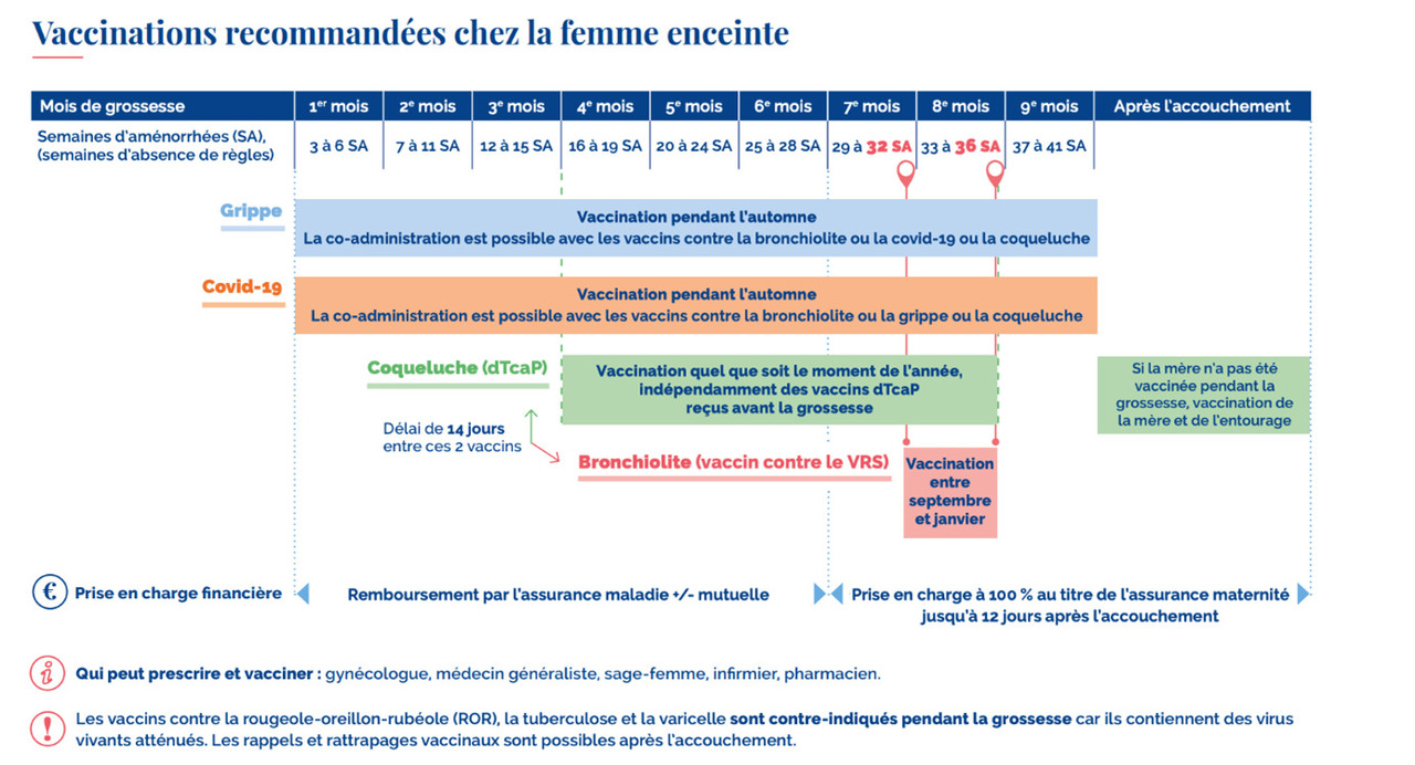 Un calendrier avec la chronologie des vaccinations recommandées pendant la grossesse est également disponible (v. figure ci-contre), téléchargeable sur ce lien.