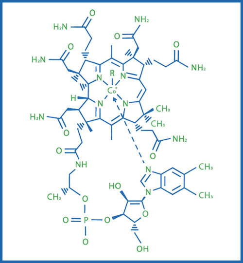 La vitamine B12 ou cobalamine est indispensable à la synthèse de la méthionine et de l’ADN, au développement de la myélinisation et à la fonction du système nerveux.