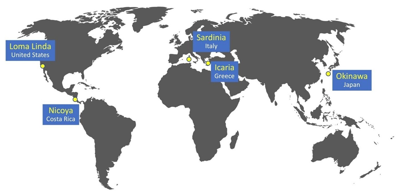 Depuis l’étude princeps de 2004, plusieurs autres ont documenté des endroits du globe qui constitueraient de nouvelles zones bleues, notamment l’île d’Ikaria en Grèce.2 L’inclusion de ces localités sur la liste des zones bleues agite la communauté scientifique depuis plusieurs années. À ce jour, Olgiastra (Italie), Okinawa (Japon) et Nicoya (Costa Rica) semblent les plus consensuelles au sein d’une partie des chercheurs (Candal-Pedreira et al., 2025) [figure]. Ikaria, Cilento (Italie), Rugao (Chine), la communauté adventiste du 7e jour de Loma Linda (Californie, États-Unis) et la Martinique sont sujettes à débat.