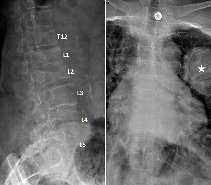 Vous faites réaliser une radiographie du rachis dorso-lombaire dont voici les clichés. Figure 1 (Salomé Abdellaoui, La Revue du Praticien)