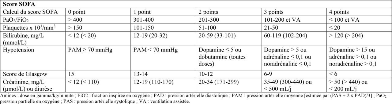 Le sepsis correspond à une réponse inappropriée de l’hôte envers une infection entraînant une dysfonction d’organe(s). Le diagnostic est retenu si le score SOFA (sepsis-related organ failure assessment) [tableau ci-dessous] atteint 2, ou augmente de deux unités (cf. infra). En l’absence des données du score SOFA, le score rapide « Quick SOFA » peut être utilisé : un sepsis est retenu si au moins deux de ces critères sont présents : fréquence respiratoire ≥ 22/min, confusion (altération aiguë des fonctions neurologiques supérieures), pression artérielle systolique ≤ 100 mmHg. Ici, la patiente a une fréquence respiratoire à 24/min et une pression artérielle systolique à 85 mmHg donc un Quick SOFA à 2. Dans ce contexte, il s’agit probablement d’un sepsis.