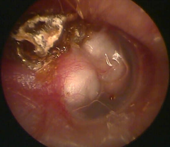 Son tympan droit montre une aggravation de la poche de rétraction : le fond de la poche n’est plus contrôlable et il y a quelques dépôts épidermiques.
