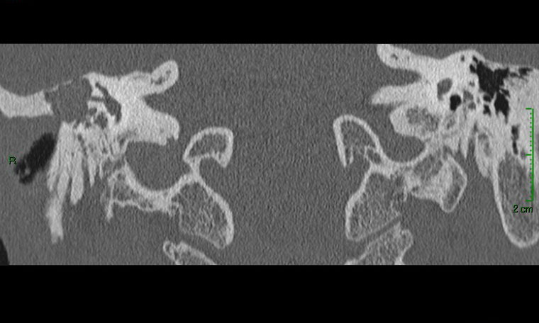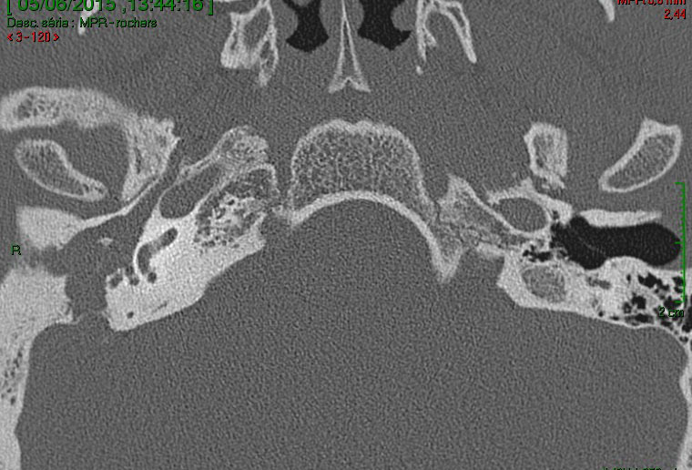 Question difficile, à laquelle on peut (et doit) répondre avec la clinique. En effet, le canal est ouvert sur le scanner (en coupe coronale sur la figure du milieu), mais surtout on peut le déduire devant le fait que le patient a un nystagmus avec un cholestéatome.