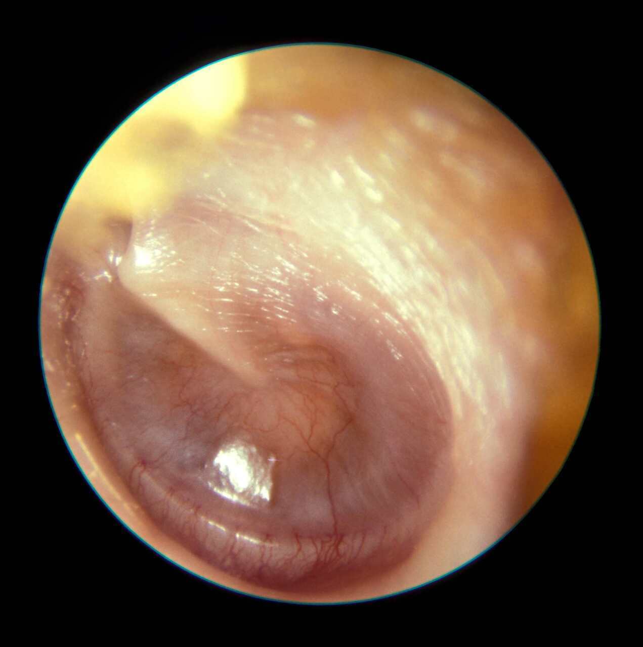 Rappel sur le tympan normal : le tympan est quasiment transparent avec le marteau bien visible et bien moulé. Le triangle lumineux (reflet de la lumière) est visible dans le quadrant antéro-inférieur. Le tympan n’est pas bombant mais tendu (pars tensa), de façon radiaire à partir de l’extrémité du manche du marteau. La pars flaccida est la partie du tympan immédiatement au-dessus de l’apophyse externe du marteau.