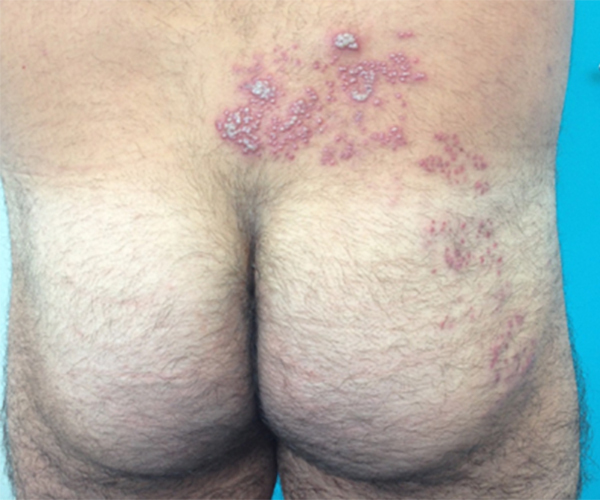 Vous avez une place qui s’est libérée en début de matinée le lendemain pour le recevoir à votre cabinet de dermatologie. À l’examen clinique complet vous observez ces lésions. Figure 2 (Antoine Bertolotti, La Revue du Praticien)