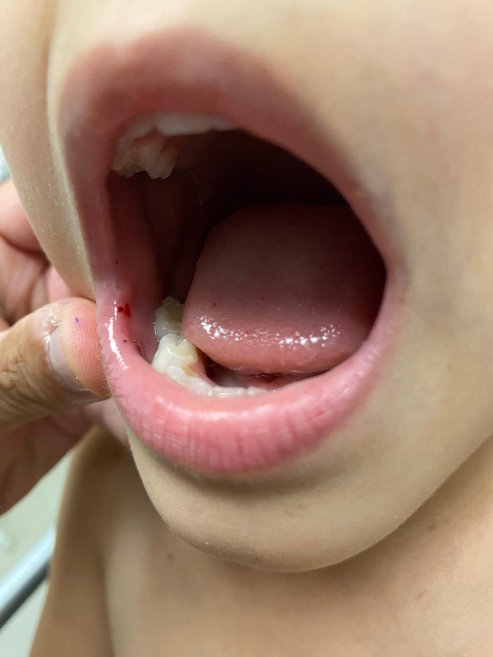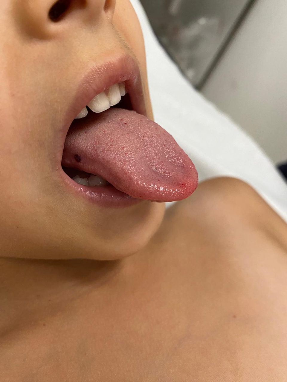 Vous interrogez les parents d’Antonin. C’est le premier épisode de ce type, il n’a pas eu de fièvre au domicile. Pas de gingivorragies, pas d’hémoptysie, pas d’hématémèse, pas de rectorragies, pas d’hématurie. Il a, dans votre box de consultation, un épisode d’épistaxis d’une durée de vingt minutes, résolutif après compression bi-digitale. Il n’a pas perdu de poids récemment et est en excellent état général. Les constantes mesurées par l’infirmier organisateur de l’accueil (IAO) sont les suivantes : température (T) = 37,2 °C ; fréquence cardiaque (FC) = 113/min ; fréquence respiratoire (FR) = 25/min ; tension artérielle (TA) = 100/60 mmHg ; saturation en oxygène (SpO2) = 99 % en air ambiant. Cliniquement, son examen est normal, notamment sur le plan neurologique, avec une nuque parfaitement souple. Vous le déshabillez complètement à la recherche d’autres lésions cutanées, et vous trouvez quelques lésions purpuriques sur le torse. Vous regardez les muqueuses et vous observez des lésions dans la bouche. Figure 2 (Mahmoud Rifai, La Revue du Praticien)Figure 3 (Mahmoud Rifai, La Revue du Praticien)