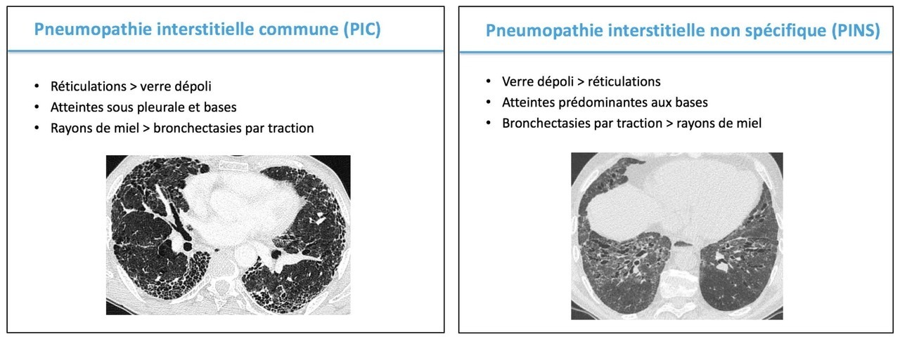 Concernant l’origine de la PID, l’on s’orientera ici préférentiellement vers l’asbestose, car le scanner montre des images qui sont plutôt en faveur de pneumopathie interstitielle commune (PIC) (absence de verre dépoli), et l’alvéolite est neutrophilique. Dans le cadre d’une PID médicamenteuse, l’alvéolite est plutôt lymphocytaire, voire éosinophilique, et les images sont plutôt en faveur d’une pneumopathie interstitielle non spécifique (PINS) (verre dépoli +++). Enfin, si l’alvéolite est plutôt neutrophilique ou lymphocytaire dans la PID de la dermatopolymyosite, le scanner montre le plus souvent des images de pneumopathie interstitielle non spécifique (PINS).