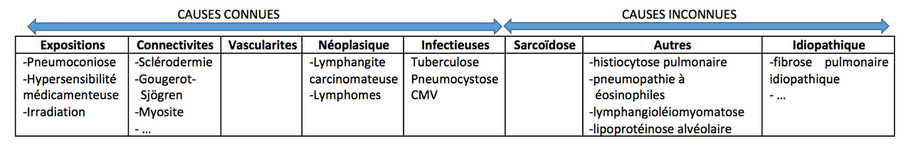 Les pneumopathies interstitielles peuvent être aiguës (< 3 semaines) ou chroniques (> 3 semaines) = infiltration de la charpente conjonctive du poumon. Concernant les causes aiguës il vous faudra penser principalement à 4 grandes étiologies : infectieuses, insuffisance cardiaque, syndrome de détresse respiratoire aiguë (SDRA) et à une acutisation d’une pneumopathie interstitielle diffuse (PID) chronique. Concernant les causes subaiguës ou chroniques : distinguer les causes connues des causes inconnues.Figure 4.