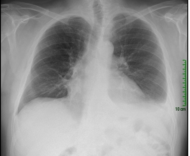Bien qu’un pneumothorax de faible/moyenne importance puisse être manqué à l’auscultation, le tableau de désaturation profonde présenté par la patiente ne serait compatible qu’avec un pneumothorax complet voire compressif, qui devrait être perçu à l’auscultation.