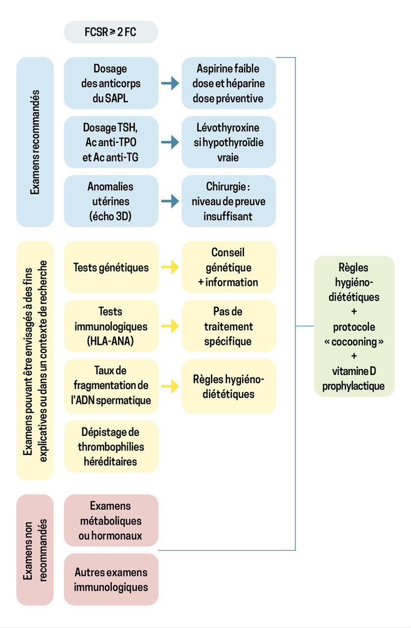 Légende : Ac : anticorps ; ANA : anticorps antinucléaires ; FC : fausse couche ; FCSR : fausses couches spontanées à répétition ; HLA : antigènes des leucocytes humains ; SAPL : syndrome des antiphospholipides ; TPO : thyropéroxydase ; TG : thyroglobuline ; TSH : thyréostimuline.