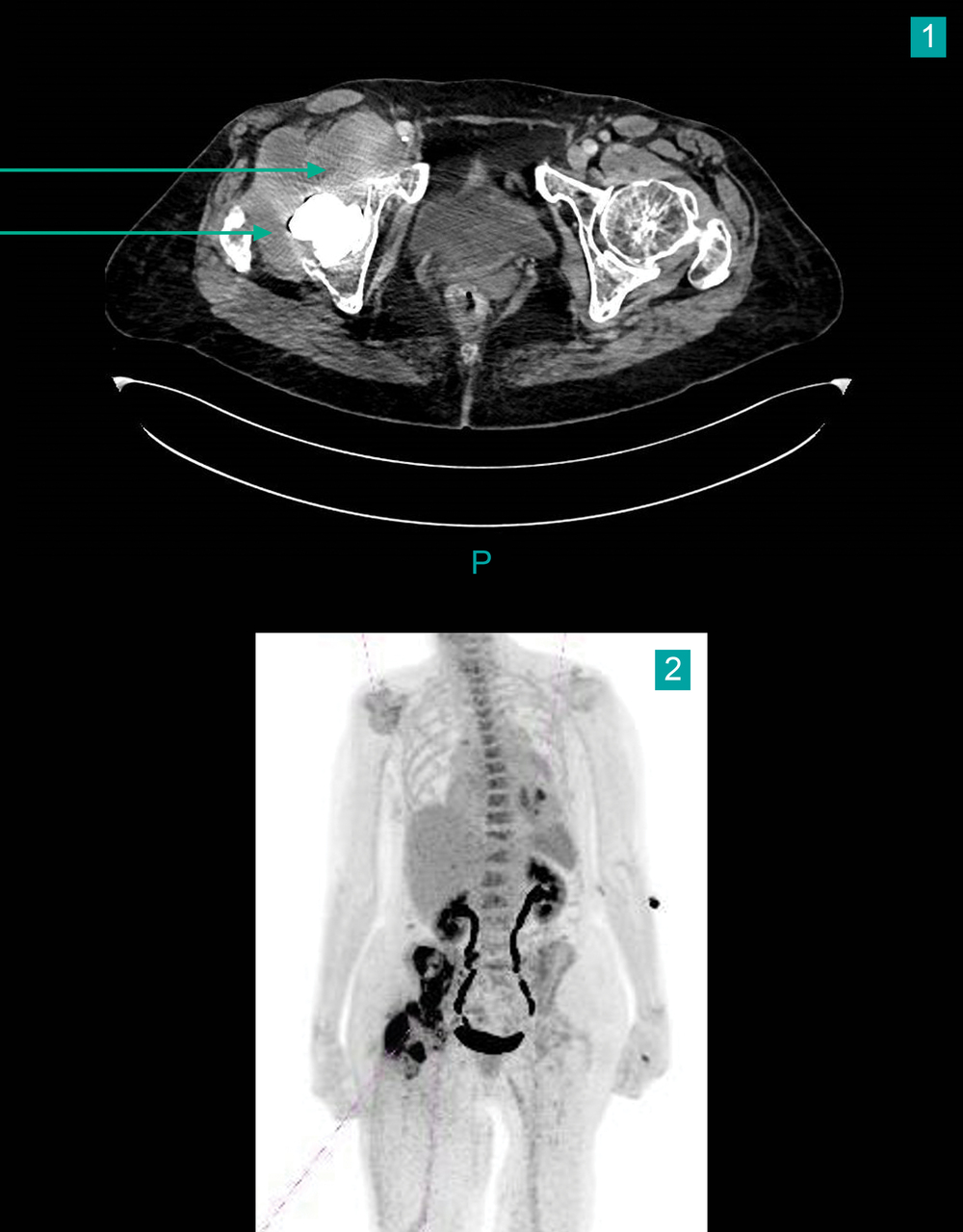 Un scanner thoraco abdomino pelvien est demandé (fig. 1), complété par une tomodensitométrie à émission de positons (TEP) scan 18 FGD (fig. 2).