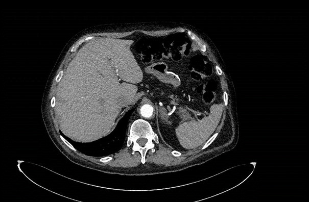 On voit sur ce scanner un aspect d’épaississement de la paroi aortique, signant la présence d’une aortite. L’anamnèse est évocatrice d’artérite à cellules géantes (ACG) avec la présence de signes céphaliques. Cette pathologie s’associe parfois à une aortite qui peut évoluer vers des complications à long terme, par exemple anévrisme et dissection, qu’il convient de dépister (scanner ou TEP scanner) et de suivre. La posologie de prednisone était probablement insuffisante dès le départ (0,5 mg/kg si PPR isolée, 0,7 mg/kg si ACG avec signes céphaliques, 1 mg/kg si atteinte ischémique).
