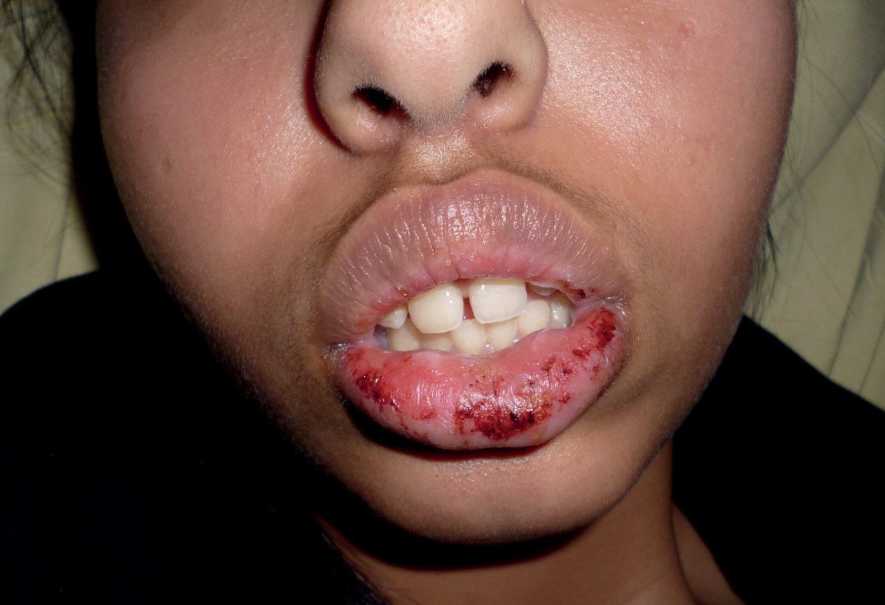 Une femme âgée de 24 ans consulte pour des lésions érosives des lèvres évoluant par poussées. Des prélèvements et une biopsie sont réalisés.