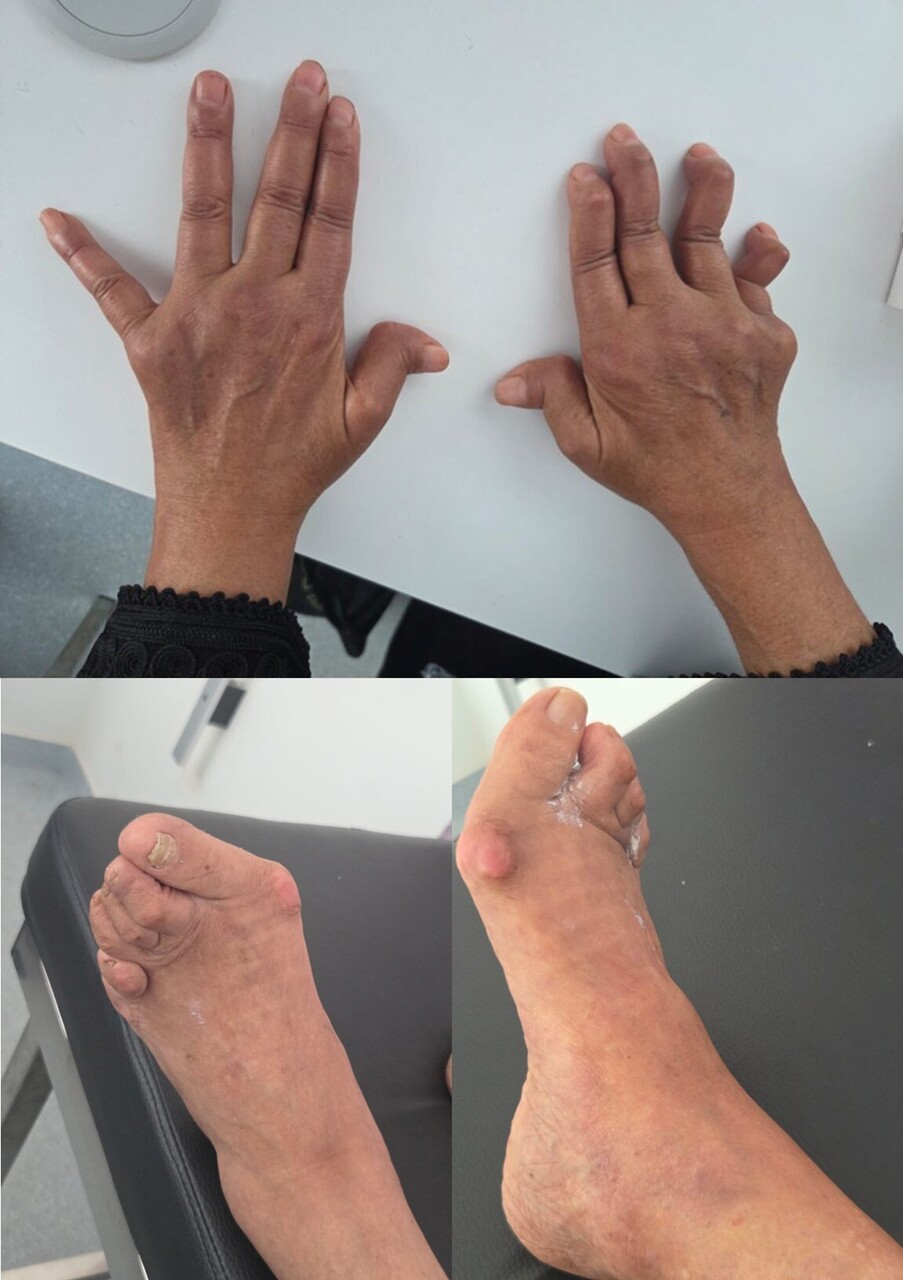 L’atteinte est à la fois bilatérale et symétrique. On observe une déviation cubitale des articulations métacarpophalangiennes (MCP) et des déformations en col de cygne et boutonnière. Des nodules rhumatoïdes sont également visibles sur le pied. Ce tableau clinique est compatible avec une polyarthrite rhumatoïde ancienne et déformante. Explications ci-dessous.
