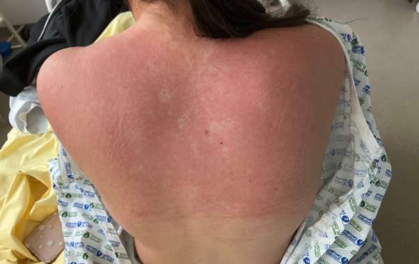 Vous recevez aux urgences cette jeune patiente de 25 ans, sans antécédent, à son retour de voyage aux Antilles, au cours duquel elle a fait de la plongée et du rafting en eau douce. Il y a 5 jours, elle a eu un syndrome pseudogrippal avec fièvre à 39,8 °C, arthromyalgies et céphalées. Depuis ce matin, elle a le rash visible sur la photo ci-dessous.