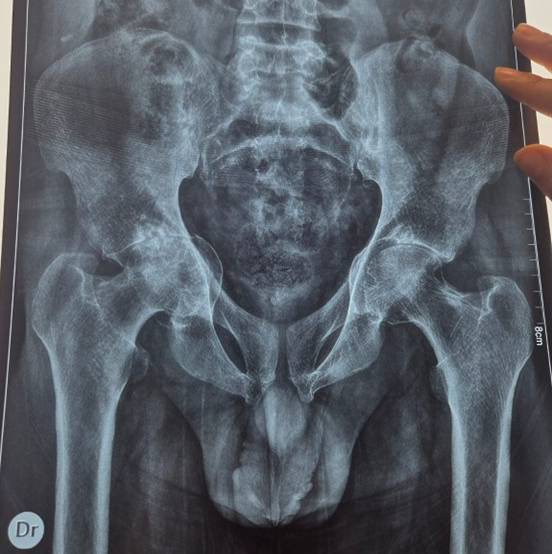 Un homme de 55 ans, sans antécédents notables, consulte pour des douleurs pelviennes et coxales chroniques évoluant depuis plusieurs années. Les douleurs sont d’installation progressive, à prédominance mécanique, majorées par la marche prolongée et la station debout, avec amélioration partielle au repos. Pas de dérouillage matinal significatif, ni de douleurs nocturnes, ni de signes généraux (fièvre, amaigrissement, altération de l’état général). Le patient ne rapporte pas de lombalgies inflammatoires, ni de douleurs fessières alternantes.
