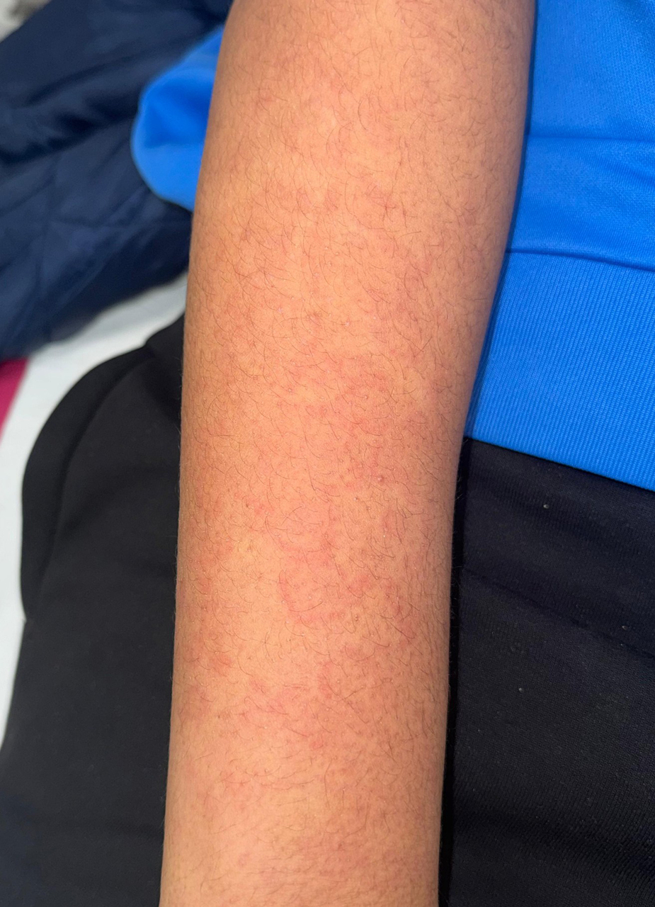 Un adolescent de 17 ans consulte pour des lésions cutanées de l’avant-bras, évoluant depuis plusieurs semaines. Il s’agit de plaques érythémateuses à contours irréguliers, parfois annulaires, non infiltrées, sans squames, non prurigineuses et indolores, d’apparition intermittente.