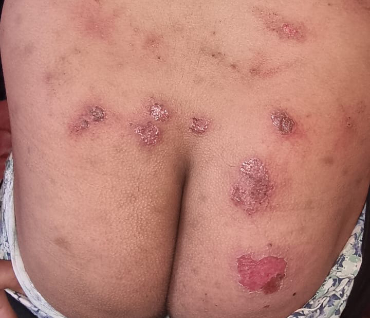 La lésion élémentaire est une tache érythémato-squameuse, congestive, bien délimitée, indolore, peu ou pas prurigineuse, recouverte d’une couche de squames sèches pouvant se détacher spontanément ou après grattage à la curette.