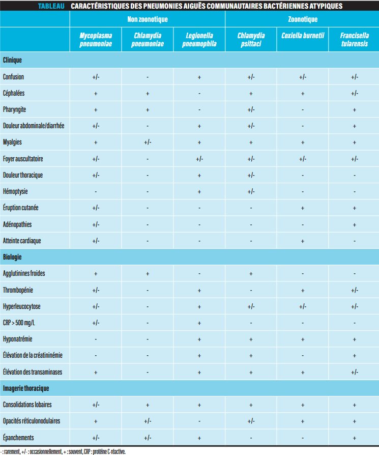 Les pneumonies bactériennes atypiques représentent jusqu’à 30 % des pneumonies communautaires ambulatoires et jusqu’à 15 % des pneumonies communautaires nécessitant une hospitalisation, parfois en soins critiques. Elles sont dues à des bactéries sans paroi cellulaire ou intracellulaires : Mycoplasma pneumoniae, Chlamydia pneumoniae et Legionella pneumophila, responsables des pneumonies bactériennes atypiques non zoonotiques ; Chlamydia psittaci, Coxiella burnetii, Francisella tularensis, responsables des pneumonies bactériennes atypiques zoonotiques (psittacose, fièvre Q et tularémie).