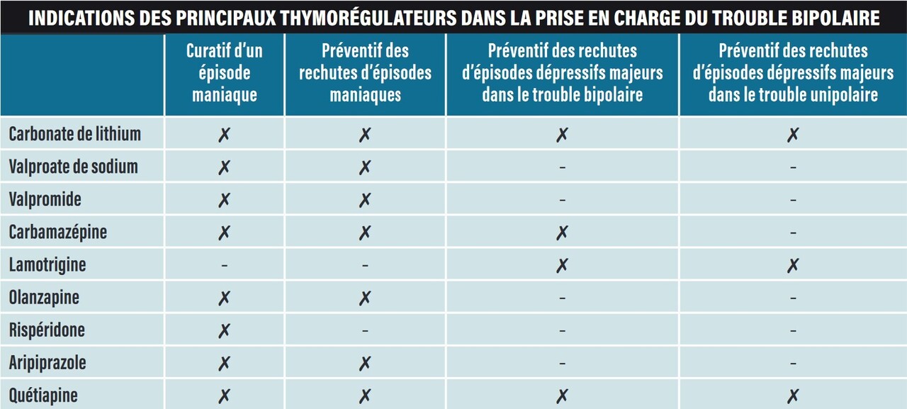 Thymorégulateurs : quelles indications ? Les indications des principaux thymorégulateurs dans la prise en charge du trouble bipolaire sont indiquées dans le tableau ci-dessous. D’après : Lançon C. Item 64. Trouble bipolaire de l’adolescent et de l’adulte. Rev Prat 2024;74(6);685-90.